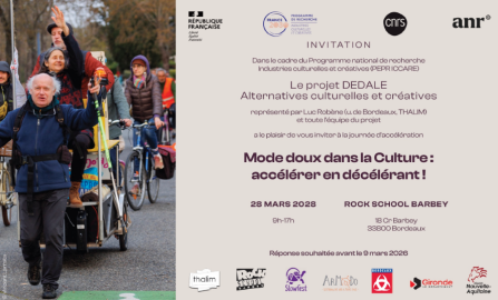Dans le cadre du PEPR ICCARE, le projet DÉDALE, représenté par Luc Robène (u. de bordeaux, THALIM) et toute l'équipe du projet, a le plaisir de vous inviter à la journée d'accélération « Mode doux dans la culture : accélérer en décélérant ! », le vendredi 28 mars 2026 de 9h à 17h à la Scènes de musiques actuelle Rock School Barbey (Bordeaux).